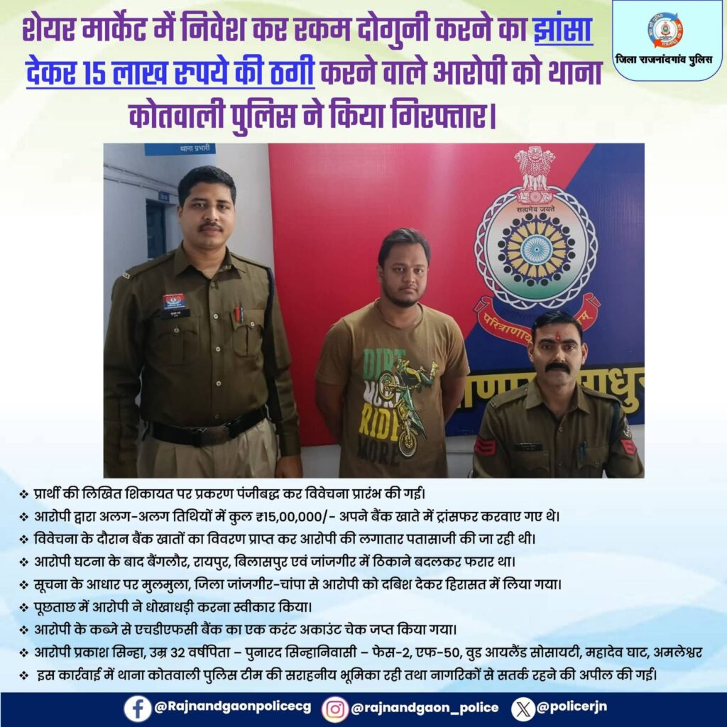 राजनादगांव पुलिस -थाना कोतवाली पुलिस को शेयर मार्केट में निवेश कर रकम दोगुनी करने का झांसा देकर 15 लाख रुपये की ठगी करने वाले आरोपी को गिरफ्तार करने में बड़ी सफलता मिली है। इस संबंध में पीड़ित द्वारा थाना कोतवाली में लिखित शिकायत दर्ज कराई गई थी, जिसमें बताया गया कि आरोपी ने एक वर्ष में निवेश की गई राशि दोगुनी करने का लालच देकर अलग-अलग तिथियों में कुल 15,00,000 रुपये अपने बैंक खाते में ट्रांसफर करवा लिए।